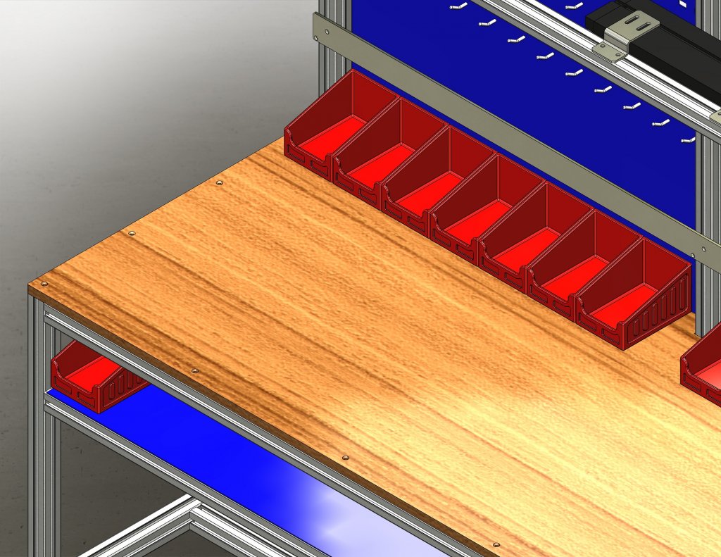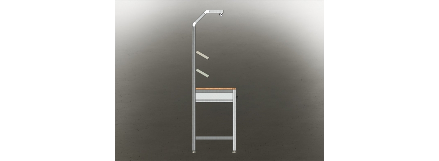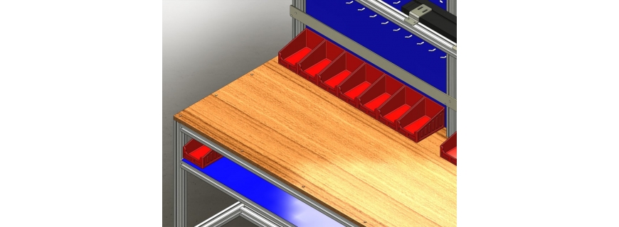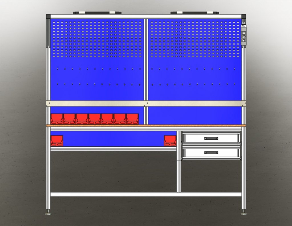 Ana şase 45x45 alüminyum sigma profilden imal edilir ve boyaya ihtiyacı yoktur. Tezgah altlarında çekmece kombinasyonları isteğe göre üretilebilir. Tezgahlara askı panosu, elektrik panosu, florasan lamba, mengene ilave edilebilir. Tezgahların üstleri 25 mm mdf pinoteks boyalı tablalardan üretilir ve tabla üstü isteğe göre dokulu lastik levha ve ya şeffaf polikarbon ile kaplanabilir. Tüm şase montajlı olup kaynak kullanılmamaktadır. Ayaklarda zemini çizmeyi ve kaymayı önlemek için krom başlıklı, kenarlardan kavrayan kauçuk lastikler bulunmaktadır.